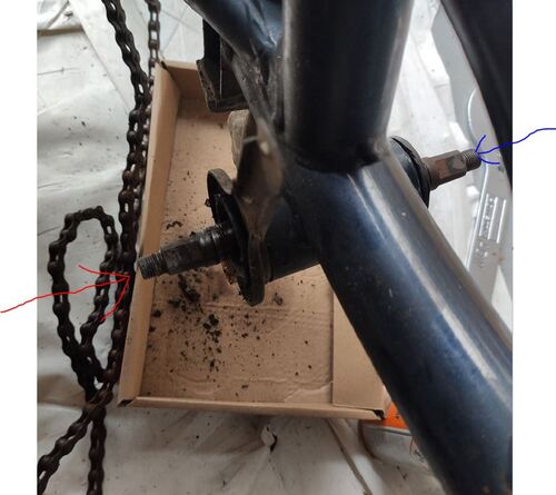 a.) ich habe die Tretlagerachse vpm der Kettenblattseite in Richtung des roten Pfeiles demontiert, wobei die Lagerschale auf der Seite des Rücktritt-Bremsenhebels im Rahmen verblieben ist - wie kann ich die Lagerschale demontieren, was ja wohl bei der Montage der Tretlagerachse bzgl. der Bremsenfeder resp. deren korrekter Position hilfreich oder sogar notwendig ist.