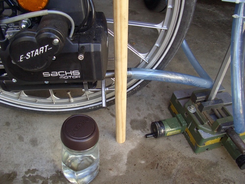Als ich feststellte das mein Adapter Gasdicht ist hatte ich gleich mehrere Ideen: Unter anderem einen Auspuffvergleichstest. Im Nachbarvorum hatte tnt-dennis von einem Auspuffschnelltest geschrieben. Meine Idee ist ähnlich, ein oben offenes U wird mit etwas Wasser befüllt, an den Auspuff angeschlossen, dann Gas gegeben, die Wassersäule steigt durch den Abgasstrom hoch, je höher desto freier ist der Auspuff. Zuerst habe ich dem ganzen nicht so recht getraut, habe ein Provisorium aufgebaut: eine 80 cm lange Gewindestange in den Schraubstock gespannt, einen transparenten ¾ Zoll ( di=19mm) mit Kabelbindern daran befestigt, mit dem Auspuff verbunden, los ging es.