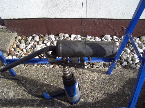 Mit diesem Adapter kann ich auch den Auspuff reinigen. Die Reinigung sollte von beiden Seiten erfolgen, also im Gleichstrom (gleiche Richtung wie Abgas durch Auspuff strömt) und Gegenstrom, also in Gegenrichtung. Gleichstrom macht keine Schwierigkeiten, aber Gegenstrom. Da der Auslass nur eine Bohrung von 8mm hat ist dies schwierig. Ich habe ein Heißluftgebläse mit 2,2kW, welches eine Heißluft von 600° erzeugen kann, die kleinste Düse ist 9mm groß, in meinen Adapter kann ich diese Düse hineinstecken, und es funktioniert. Leider noch keine Bilder. Vor einiger Zeit hatte ich einen älteren Kat-Auspuff an einen Unterstellbock gehängt, zum Test ob dies überhaupt geht. Es geht: