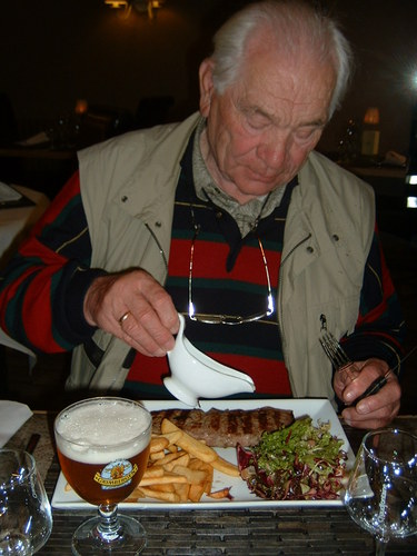 Der Sprit war übrigens etwas preiswerter, als bei uns, aber bei dem geringen Verbrauch ist das ja kaum ausschlaggebend. Wir haben es uns natürlich auch gut gehen lassen, wie man unschwer erkennen kann: Entrecôte vom belgischen Rind (...eben noch auf der Weide, jetzt schon auf dem Teller - s.o.), leckere Beilagen (die belgischen Pommes Frites sind ja berühmt) und natürlich ein „Grimbergen“, urwürziges Trapistenbier aus der nahegelegenen Abtei...