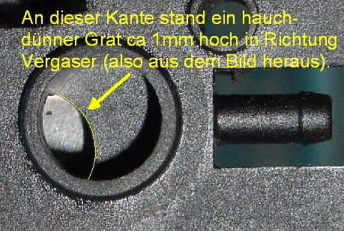 3. Die Morini-Membranplatte hatte beim Gießen nicht exakt plazierte Werkzeuge. Im Innern blieb ein haarfeiner Grat von 1mm Höhe stehen. Deshalb behinderte nicht nur der standardmäßige Versatz des Kanals, sondern das Frischgas musste noch einen Hürdenlauf machen.