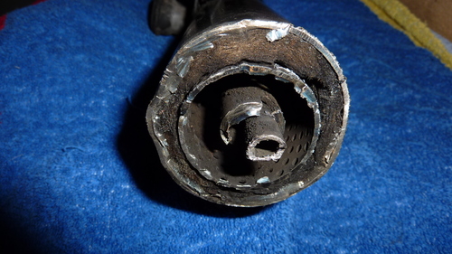 War jetzt mal ganz neugierig.Habe einen weiteren defekten Auspuff mit den gleichen Symptomen zerflückt.Es ist das gelochte Rohr