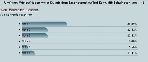 Da die Umfrageergebnisse immer erst nach der eigenen Eingabe einsehbar sind, aber nicht jeder bei Ebay gekauft hat, werde ich das Ergebnis am kommenden Samstag hier veröffentlichen.