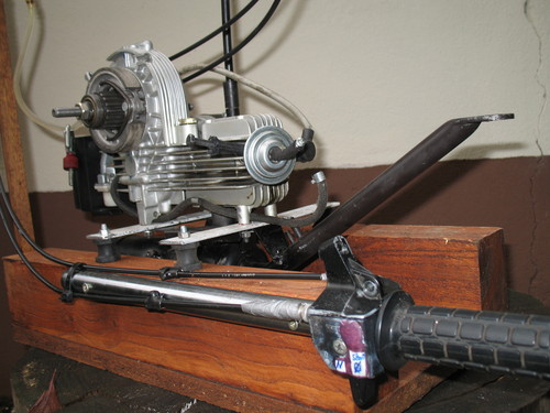 Nachdem ich meinen Reservemotor zerlegt und mit neuen Dichtringen und einem neuen Kolbenring ausgerüstet habe wollte ich einen Probelauf durchführen ohne ein Hinterrad mit Motor auszubauen.Ich habe deshalb einen Motorprüfstand gebaut.Der Motor ist auf 4 Gummisilentblöcke gelagert. An der Seite einen Gasgriff mit Choke angebaut der über Bautenzüge mit dem Vergaser verbunden ist.Der Motor sprang nach mehrmaligen ziehen am Seilzug an und lief einwandfrei.