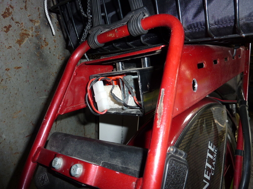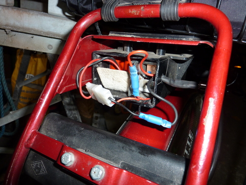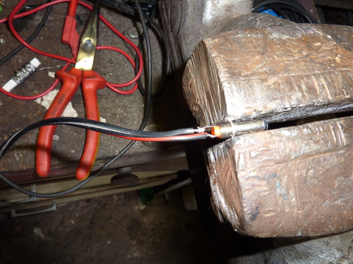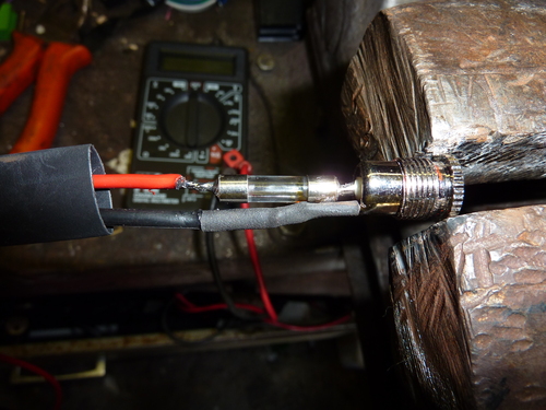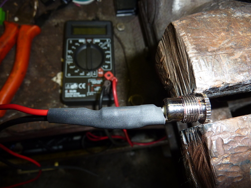 Drähte und eine Sicherung als Sabotageschutz an die Buchse angelötet.Wer´s nachmachen will: 1A,die Sicherung.0,5A war zu wenig - ist durchgeknallt.