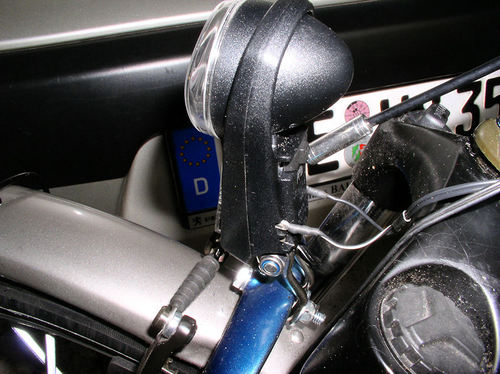 Die Halterung gehört zur Lampe und ist schon montiert, man muss sie halt nur noch am Möfchen, an der Schutzblechschraube, anschrauben.