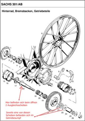 Bei der Demontage des 301 Motors fand ich im Getriebesumpf 2 Scheiben , die Welle habe ich bei der Demontage nicht gezogen., allerdings habe ich das Rad mit den Lagern und Simmering abgezogen.