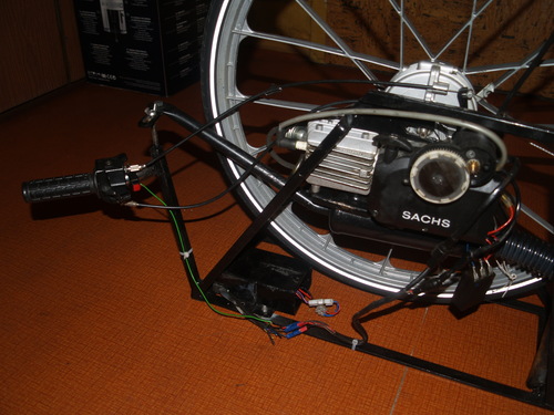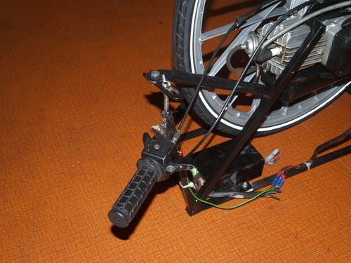 Zunächst habe ich einen Lenker gekürzt und ihn an den vorhandenen Prüfstand angeschweißt. Nun kann ich "richtig" Gas geben. Auch habe ich einen Starterknopf für nden Estarter biund eine Startelektronik angebracht.