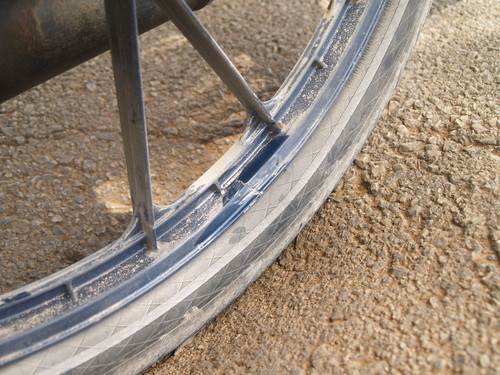 Da ich mich umgesehen hatte, um zu schauen, ob ich auf die Fahrbahn wechseln konnte, übersah ich das Schlagloch. Es rumste umd die Felge hatte einen Riss.